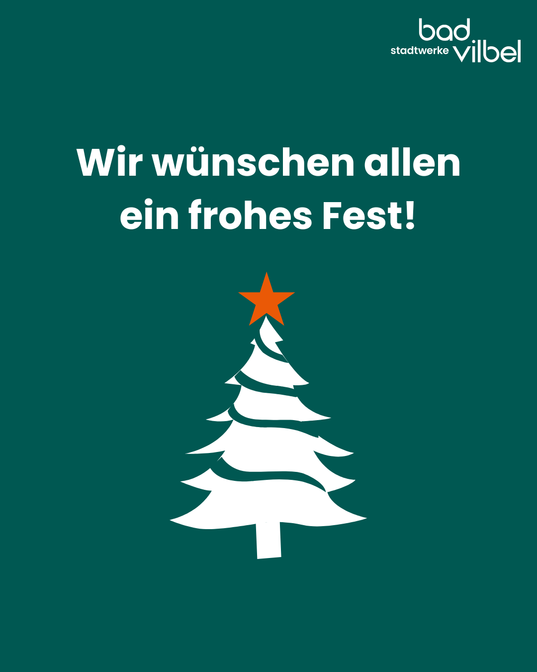 Die Stadtwerke Bad Vilbel wünschen allen Bürgerinnen und Bürgern sowie unseren Kundinnen und Kunden ein frohes Fest und erholsame Feiertage. Wir bedanken uns herzlich für das entgegengebrachte Vertrauen und die gute Zusammenarbeit im vergangenen Jahr und freuen uns darauf, auch weiterhin zuverlässig für Sie da zu sein.